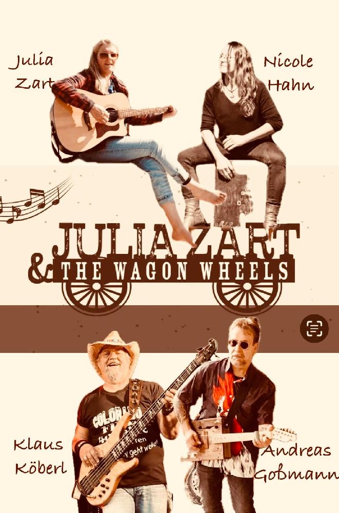 Wunderbare Musik aus Country, Singer/Songwriter, Folk, Blues und Soul. Songs von Johnny Cash, Dolly Parton, Janis Joplin, Vince Gill und C.C.R. Julia Zart & The Waggon Wheels vermitteln ein typisches amerikanisches Lebensgefühl von Freiheit, Abenteuer, Wild-West-Romantik. Im Mittelpunkt steht Julia Zart mit ihrer markanten Stimme und geschmackvollem Gitarrenspiel. Begleitet wird sie von Nicole Hahn (Percussion/Gesang), Andreas Gossmann (Gitarre/Gesang) und Klaus Köberl (Bass/Gitarre).